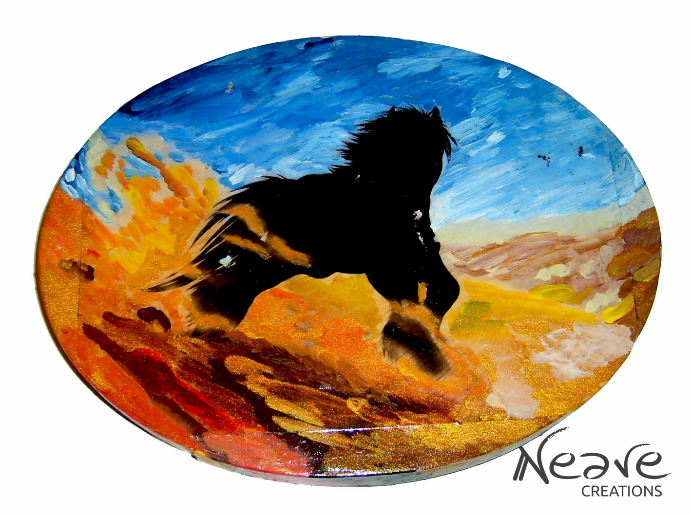 Szkatułka pomalowana bejcą firmy Flugger w kolorze ciemnego brązu, zaś koń został namalowany farbami akrylowymi. Wszystko wykończone lakierem w połysku.