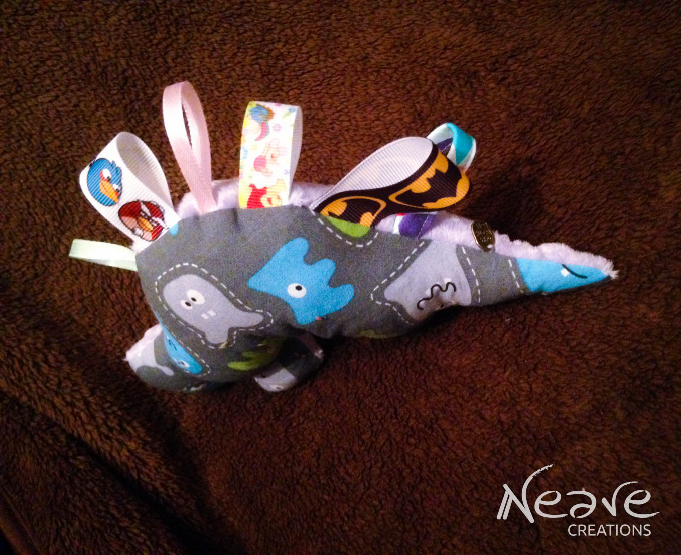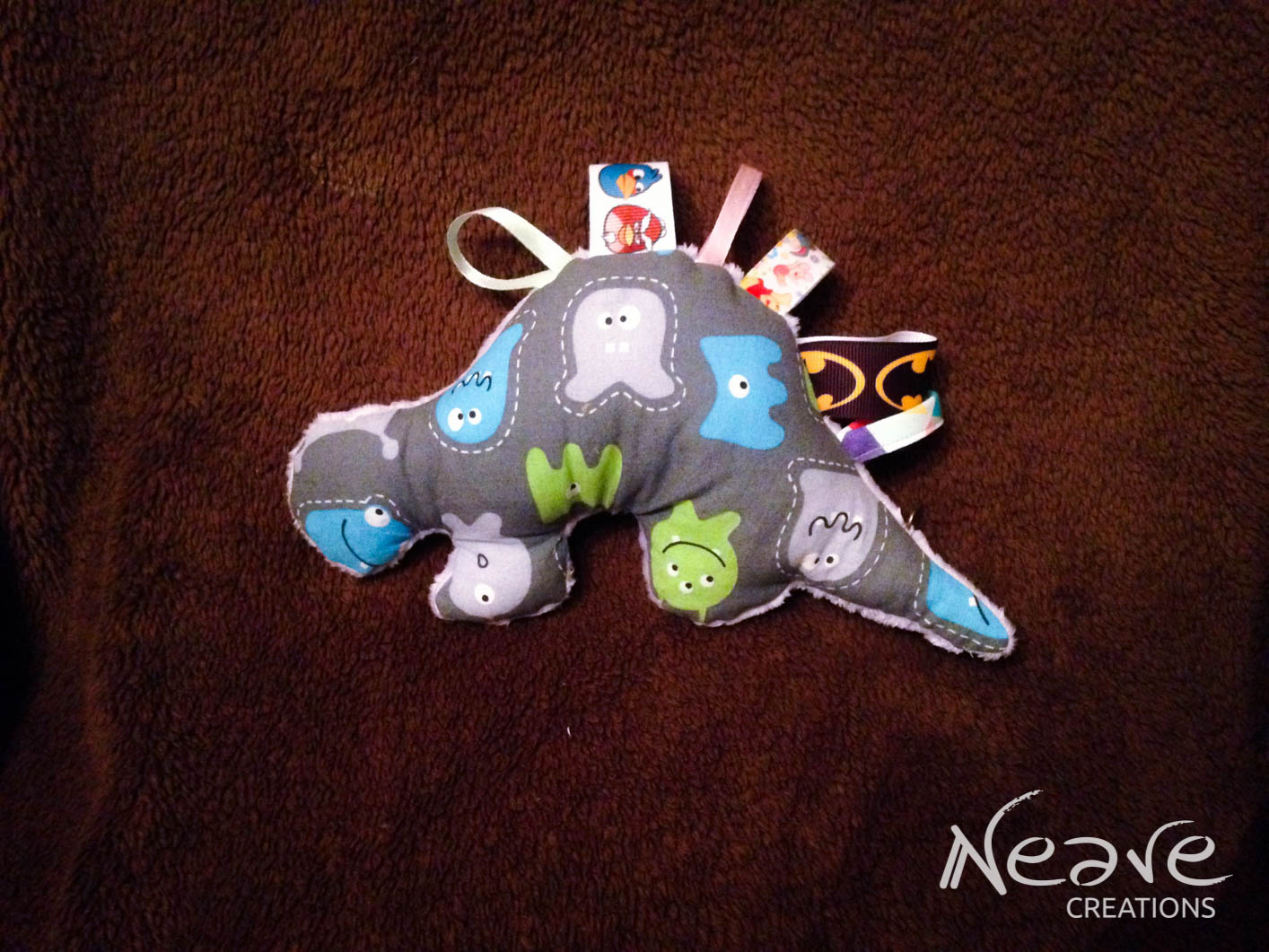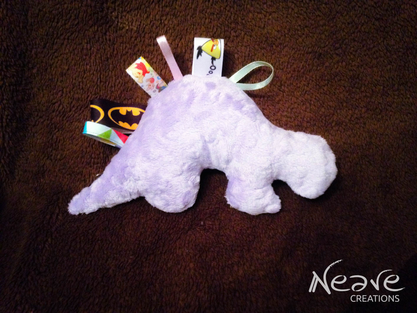 Dinuś – bawełna 100% w kosmitów, minky lawendowe, tasiemki rypsowe oraz lamówka Sweetness, a w głowie mały szeleścik