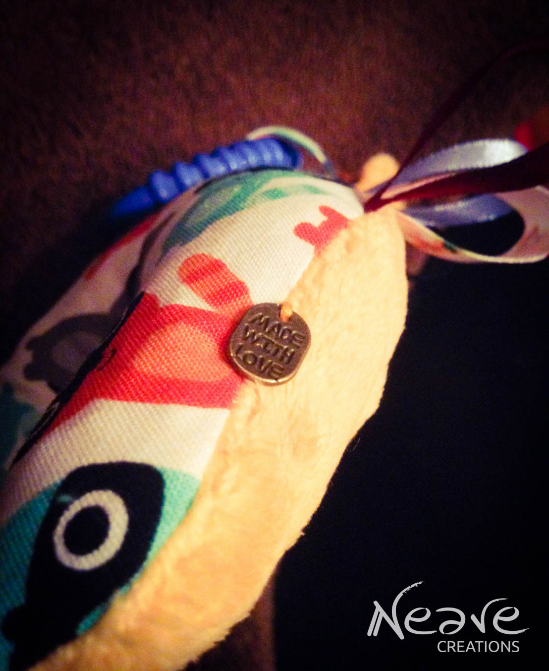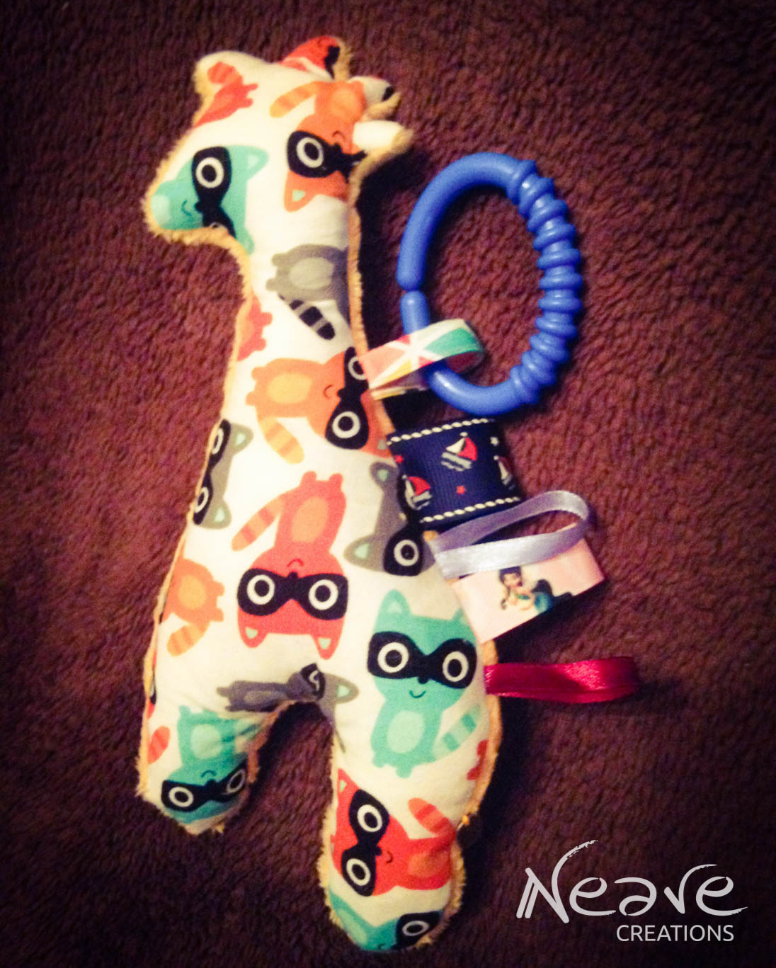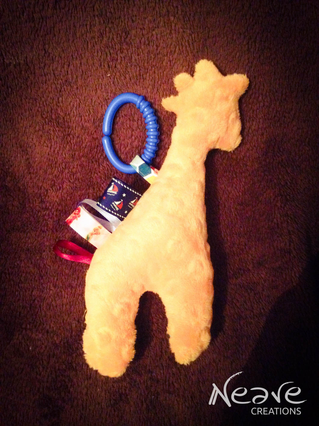 Żyrafka – bawełna 100% w szopy, cudowne minky w kolorze mango Shannon Fabrics, tasiemki rypsowe oraz lamówka Sweetness, a do tego gryzak, piszczek w głowie i szeleścik w nodze