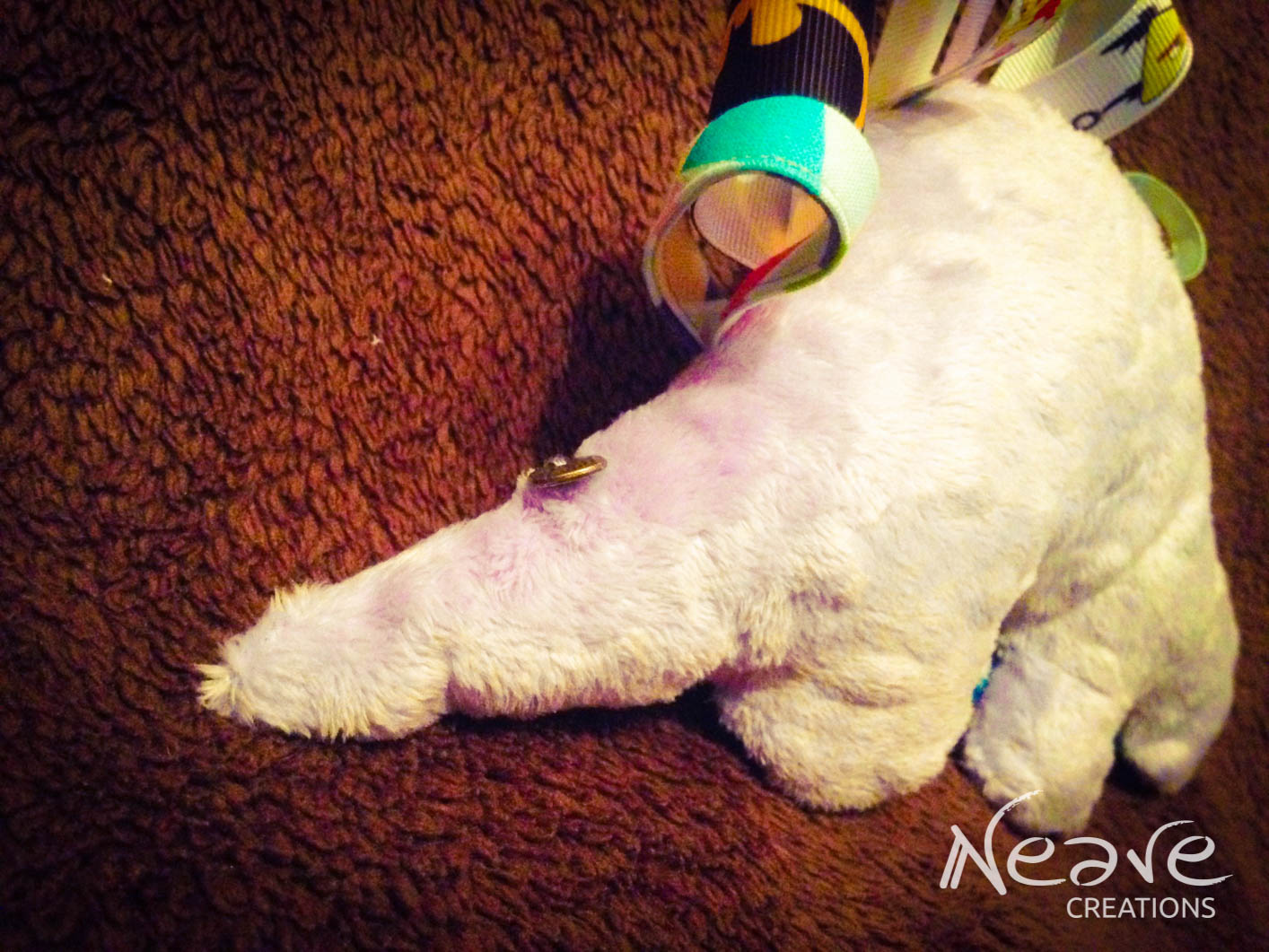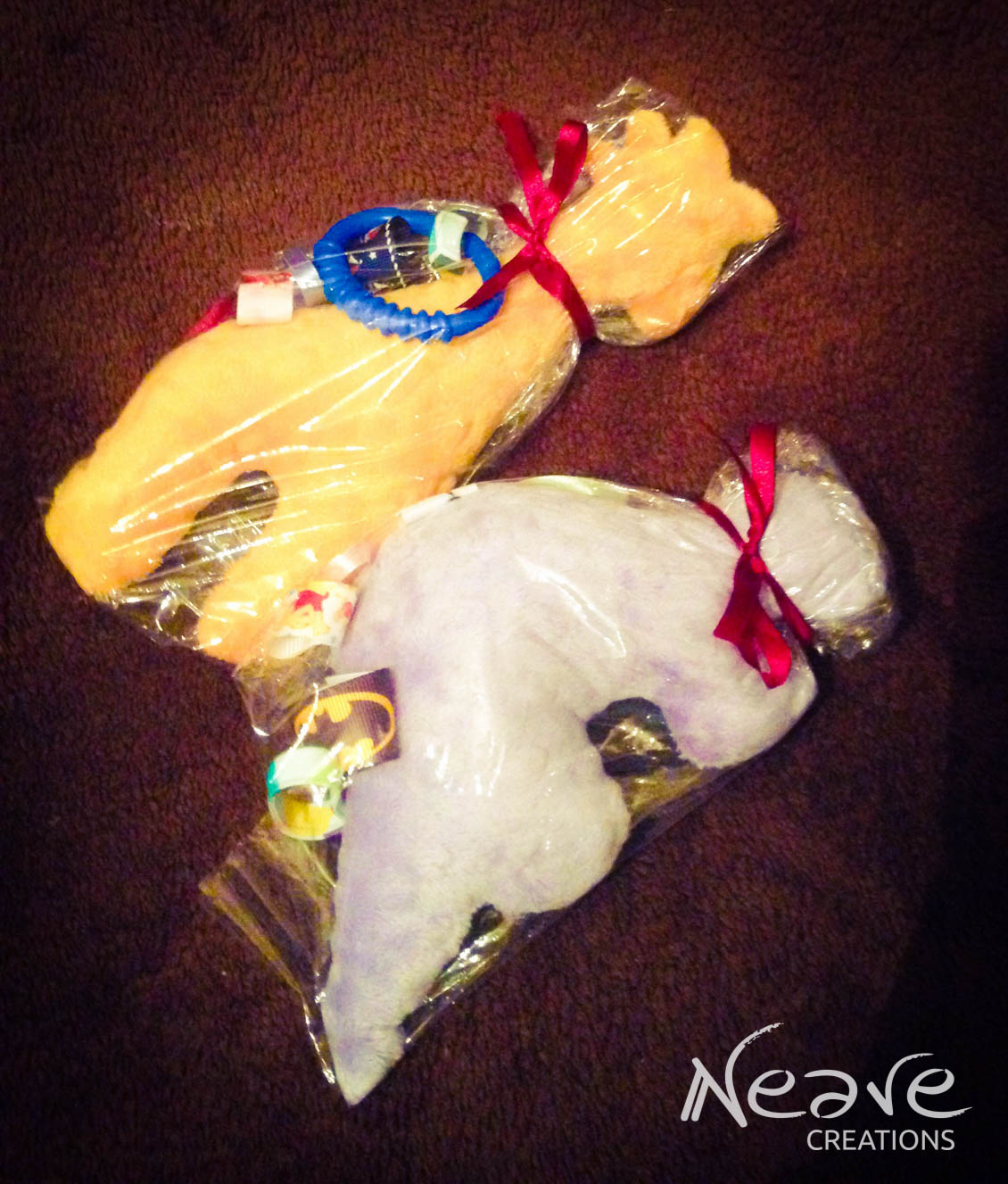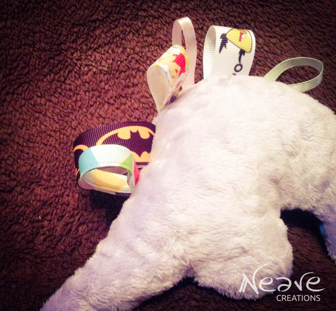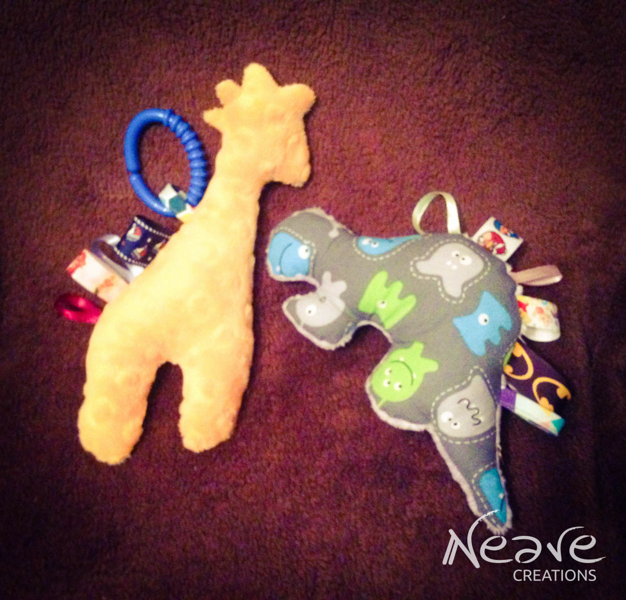 Żyrafka – bawełna 100% w szopy, cudowne minky w kolorze mango Shannon Fabrics, tasiemki rypsowe oraz lamówka Sweetness, a do tego gryzak, piszczek w głowie i szeleścik w nodze