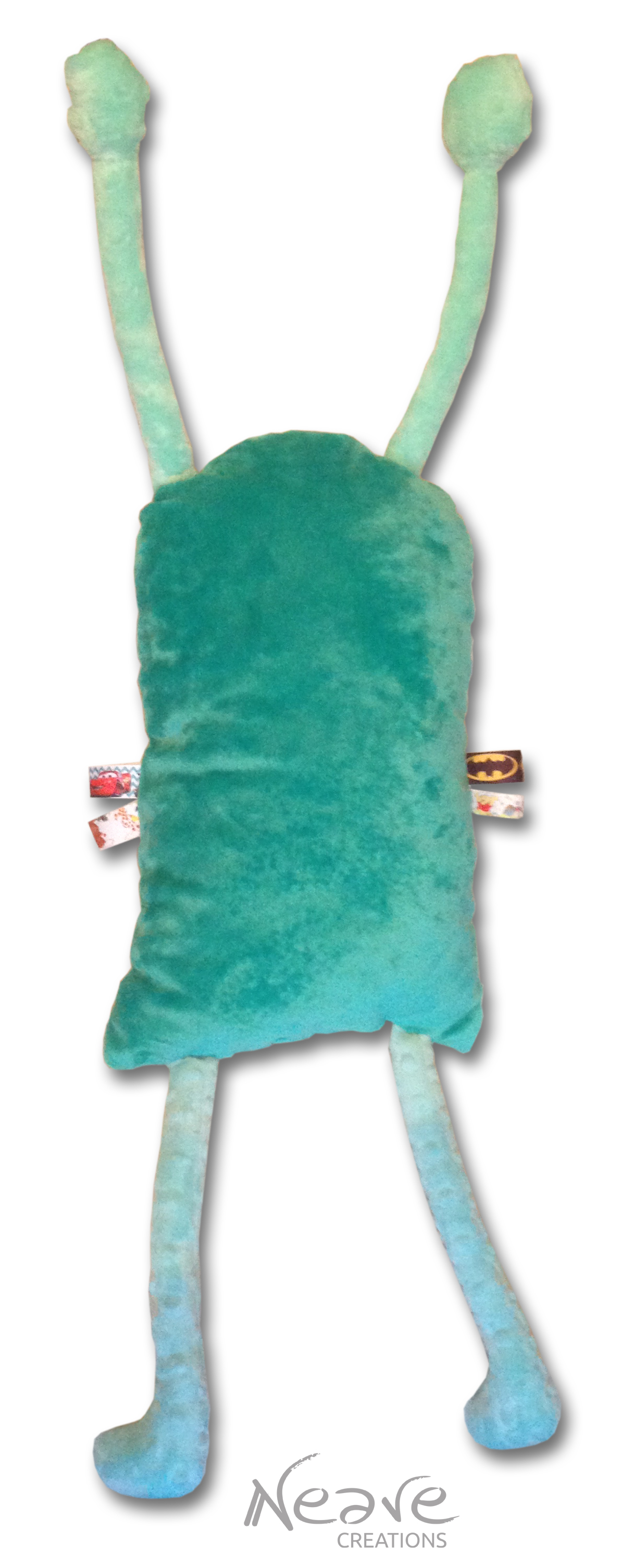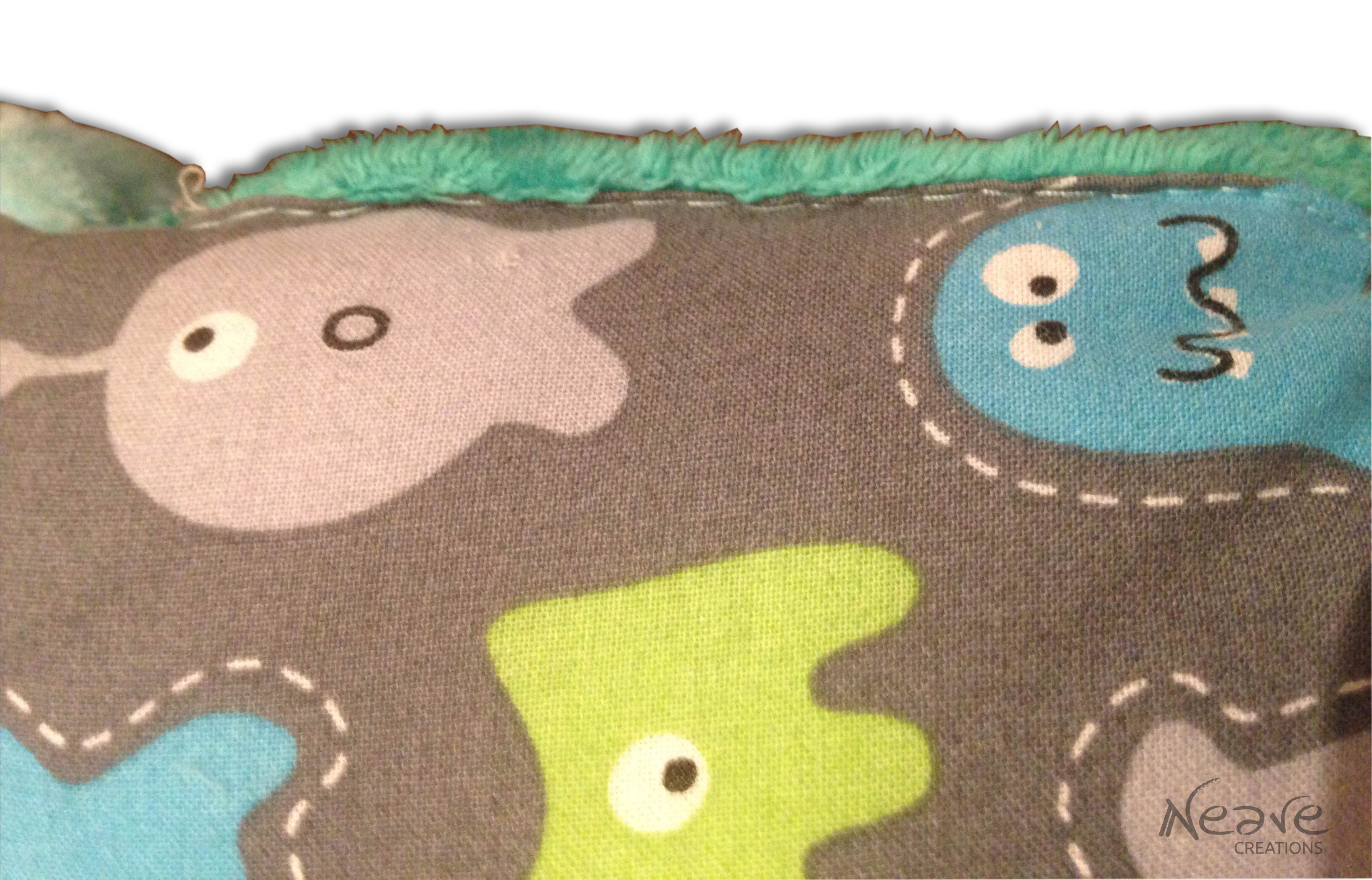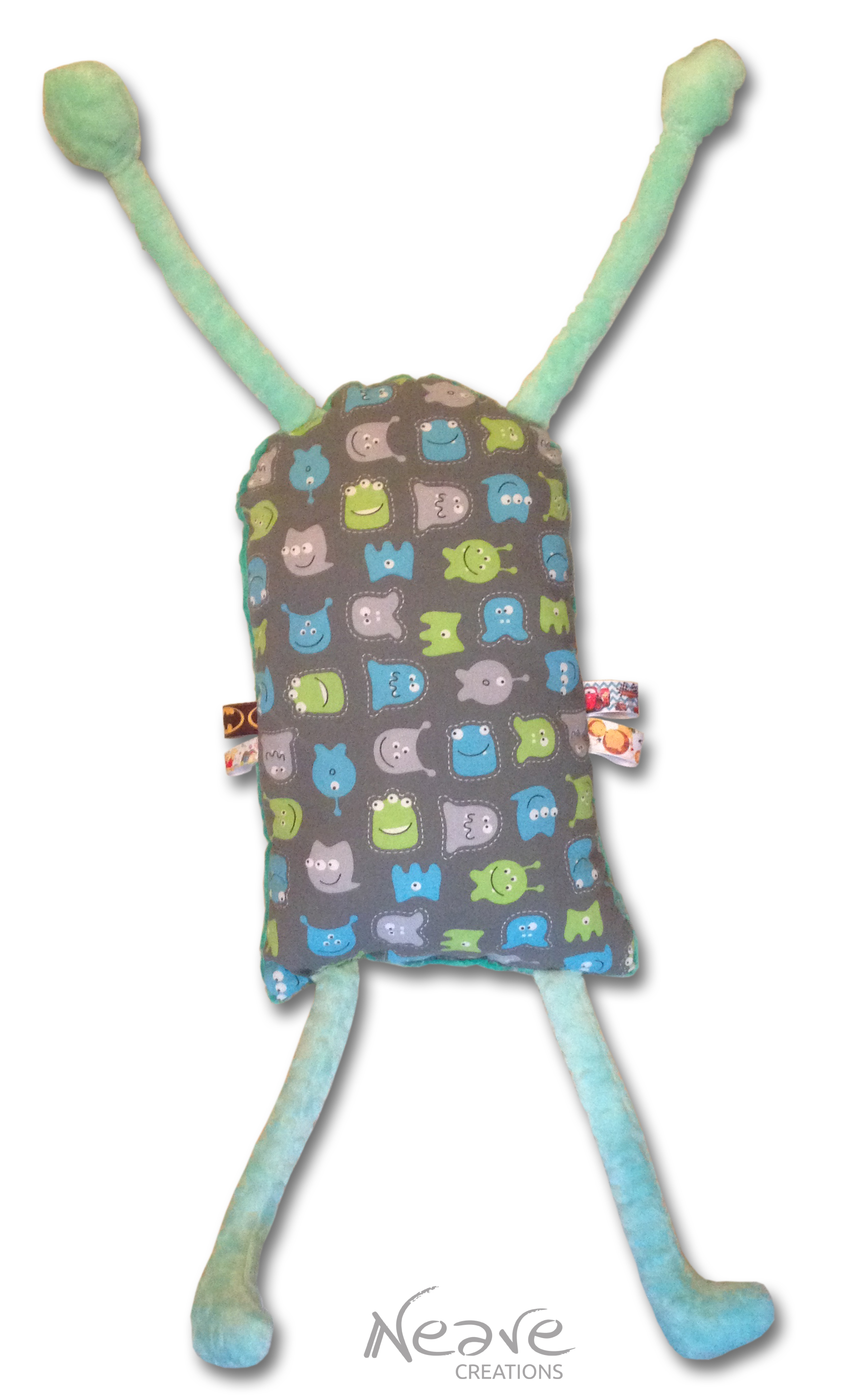 Wykonana z bawełny w kolorowe duszki na szarym tle z przodu oraz gładkiego minky w kolorze Sea Foam (380g) z tyłu. Czułki wykonałam z minky w kolorze Opal (400g), nogi różnią się odrobinę odcieniem. Do tego z każdej strony doszyłam po 2 metki rypsowe (długości ok. 8-10cm).